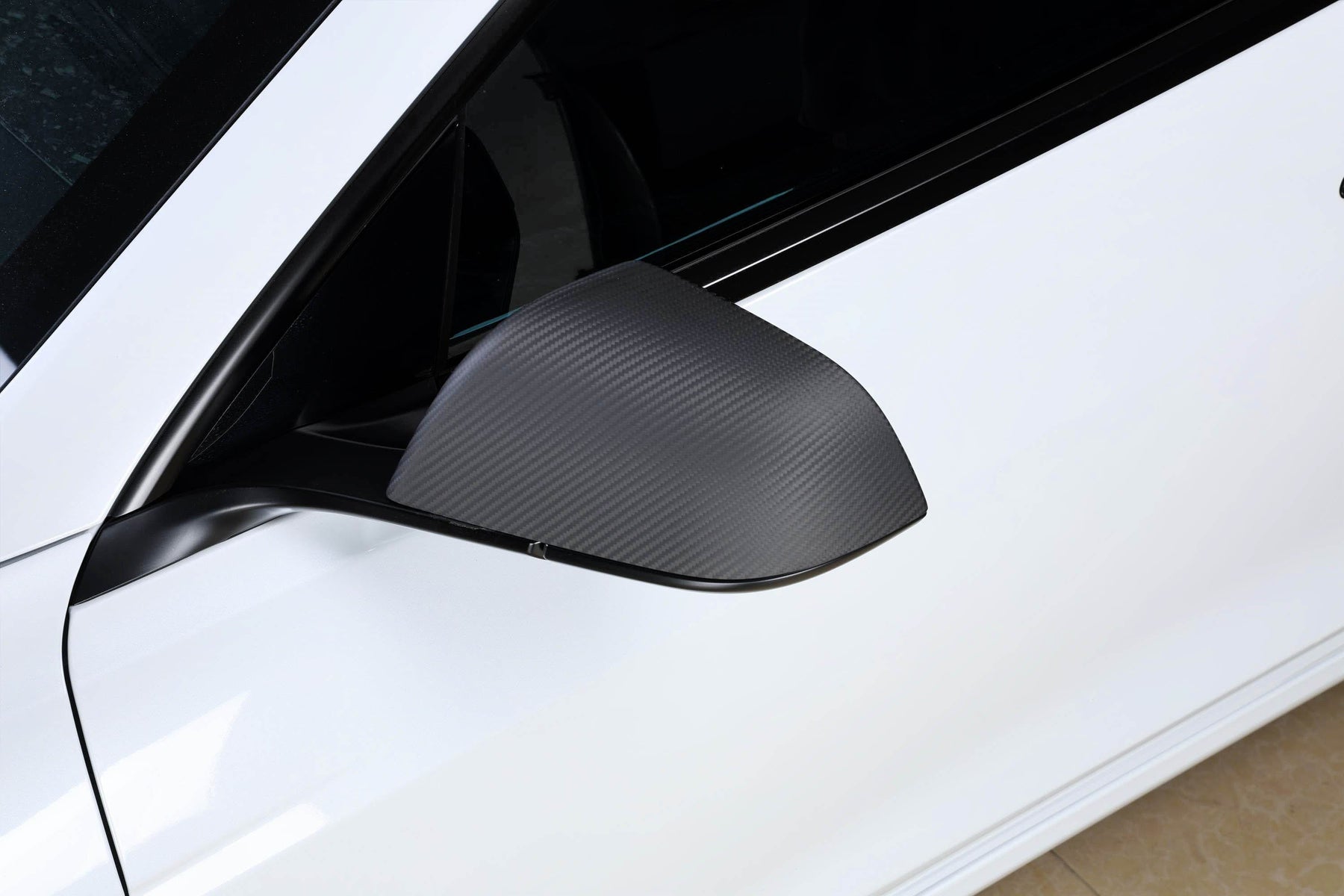 Real Molded Matte Carbon Fiber Side Mirror Overlay Covers for Tesla Model 3 2023-2024 Highland - PimpMyEV Free Shipping