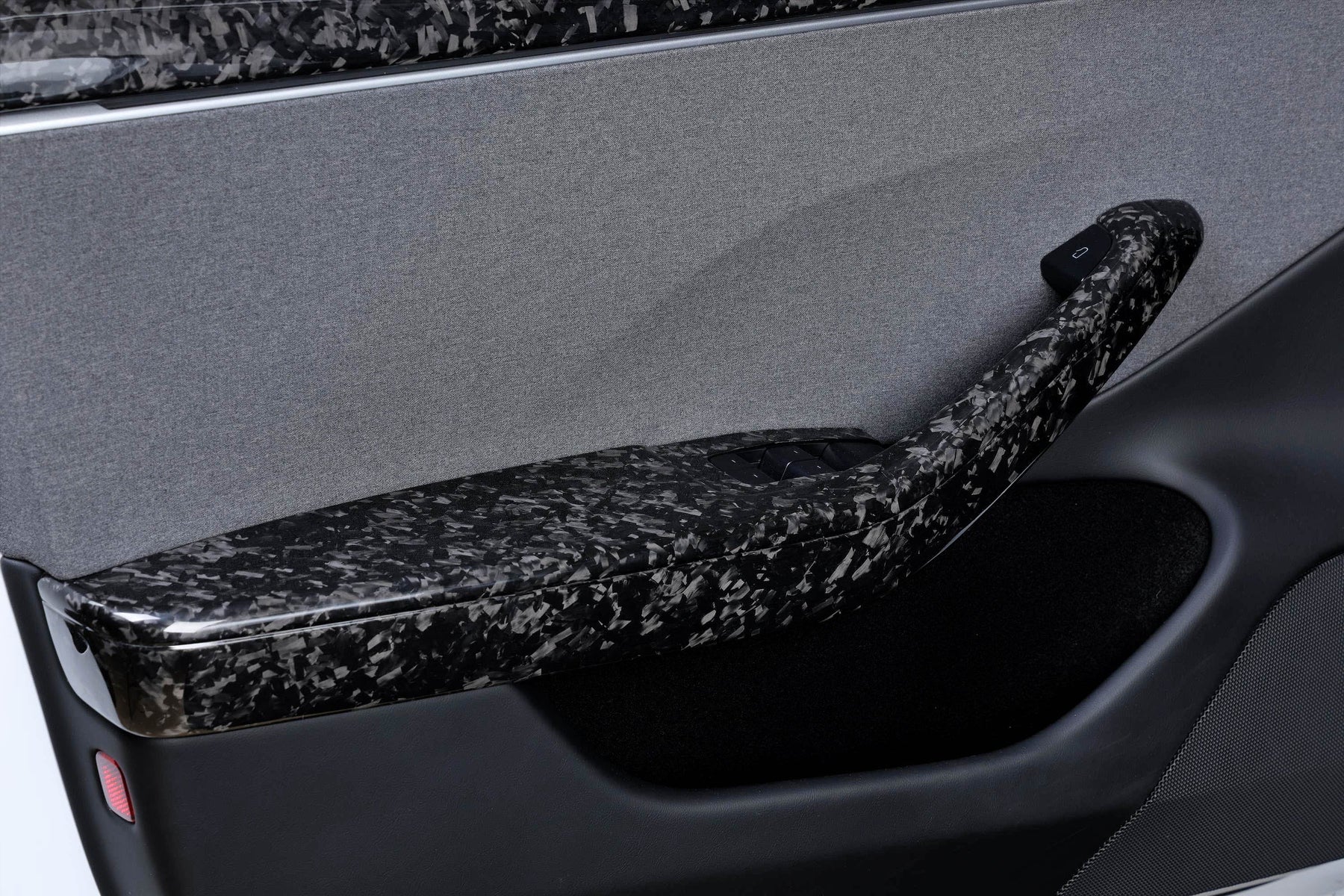 Real gloss forged carbon fiber trims that are precision-engineered to fit Model 3 door armrest trims.