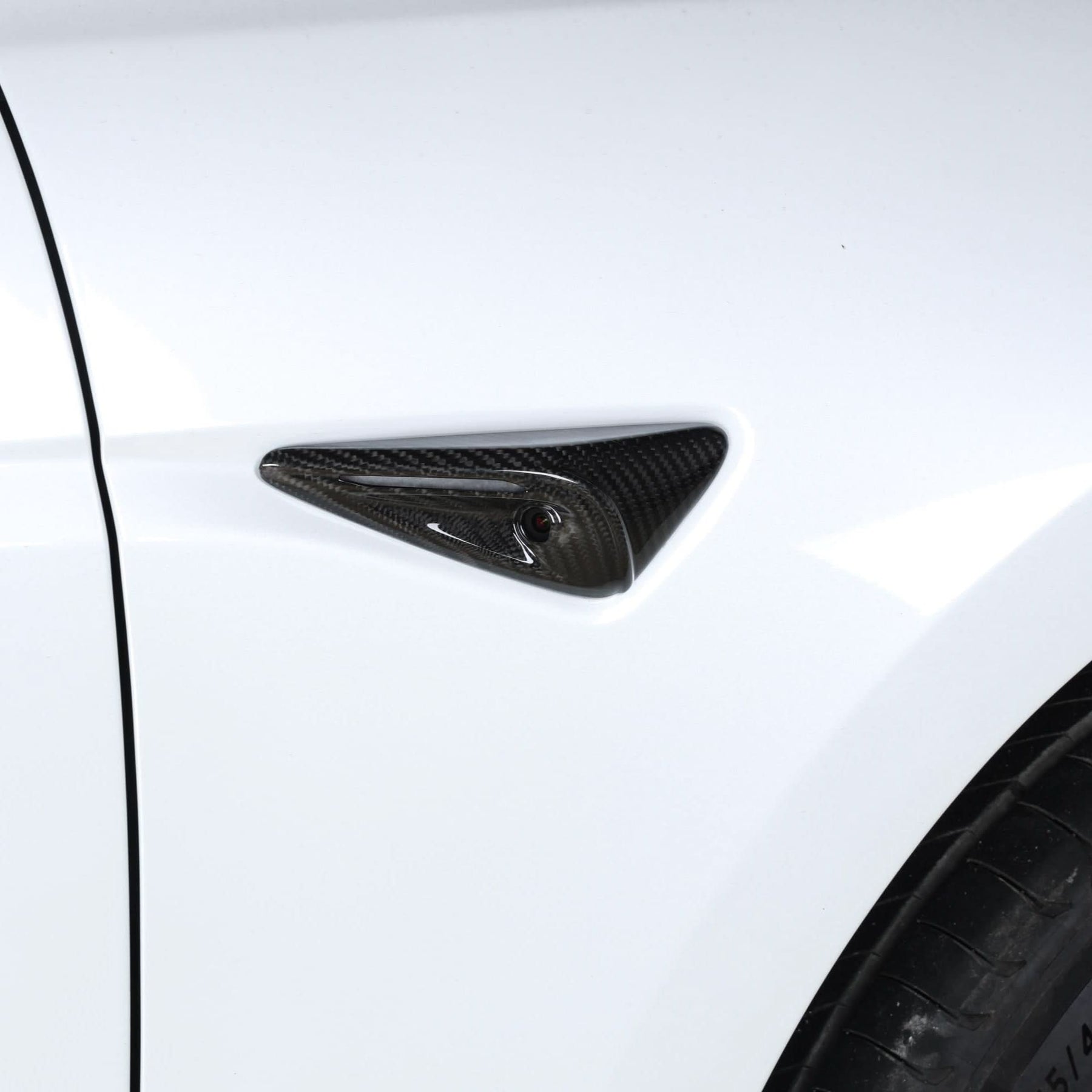 For ultimate quality and an overall superior aesthetic, the Real Molded Gloss Carbon Fiber Turn Signal Side Marker Overlay Camera Covers HW4 for Tesla Model Y Juniper 2025-2026 is your ultimate choice. SECURE YOURS NOW.