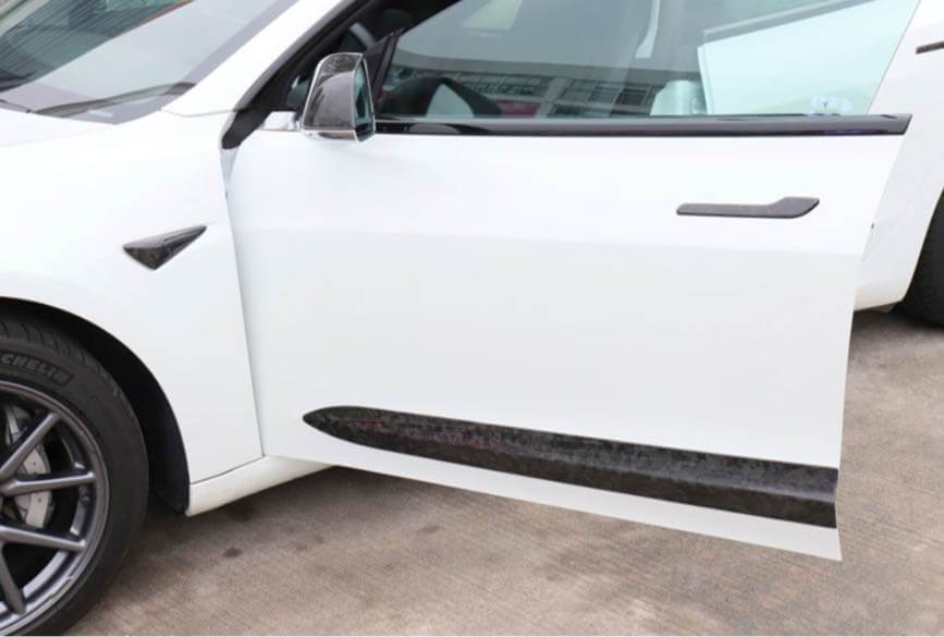 Gloss carbon fiber external door trims to complete the look. These trims have been precision engineered with the exact fit for Model 3.