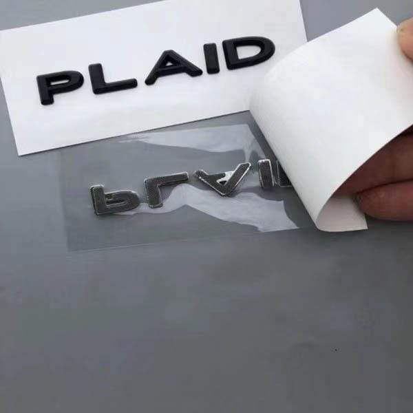 Detach the product's adhesive backing by tearing the tape off the back and sticking the tesla plaid badge to the desired installation spot.