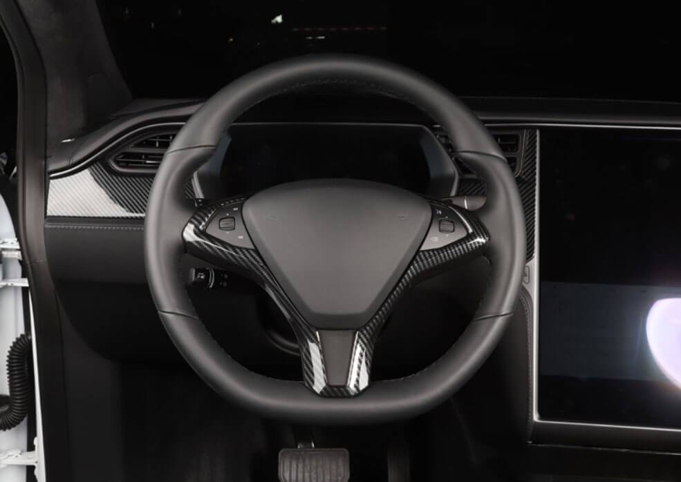 Carbon fiber look trims that are precision-engineered to fit Model S Steering Wheel