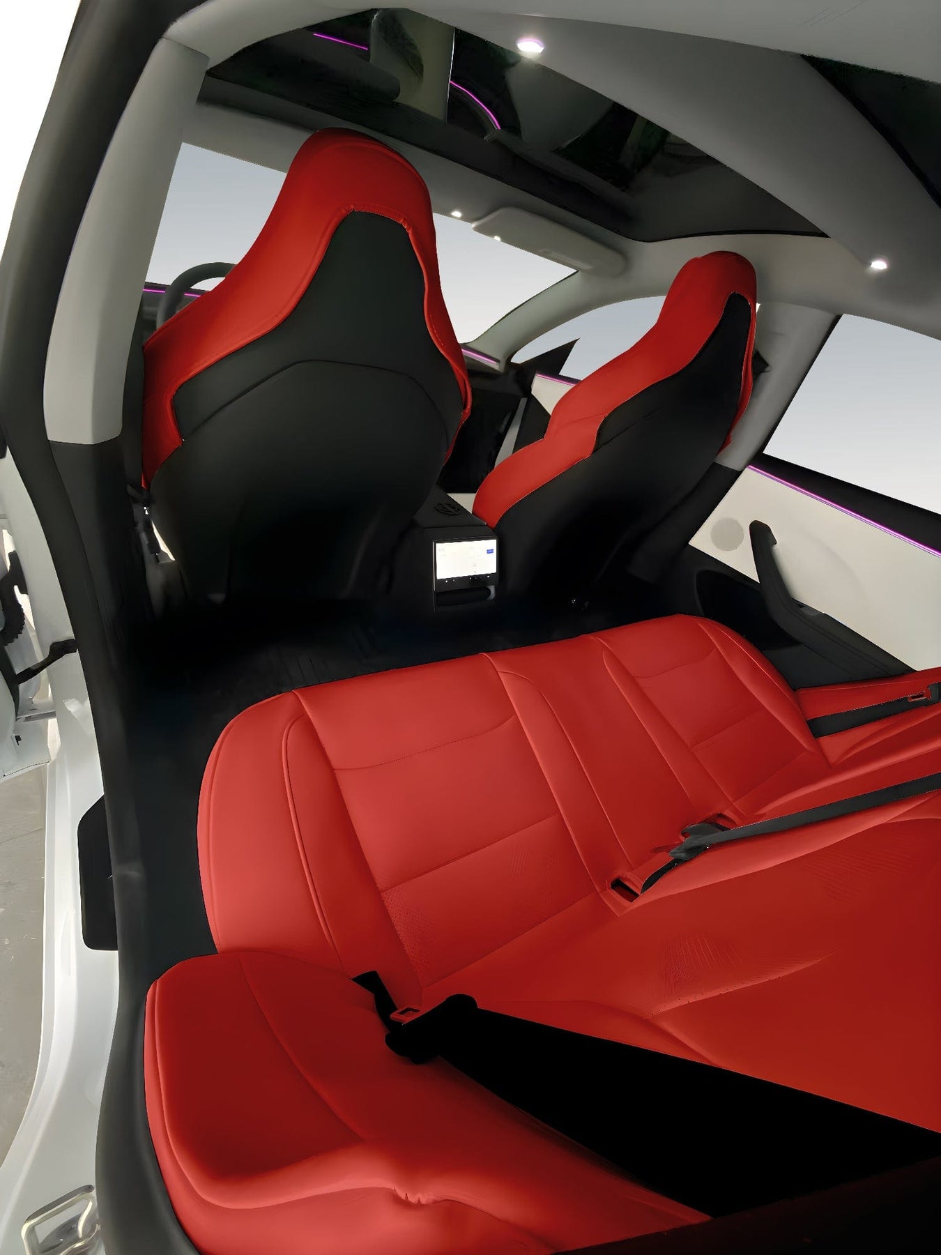 Embrace durability with Vegan Tesla Leather Car Seat Covers, crafted from resilient, smooth material that is easy to clean and provides a comfortable seating experience in your Model 3 Highland Performance version.