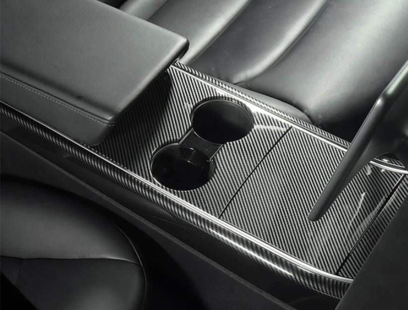 Water transfer carbon fiber design trims that are precision-engineered to fit Model 3 center console.