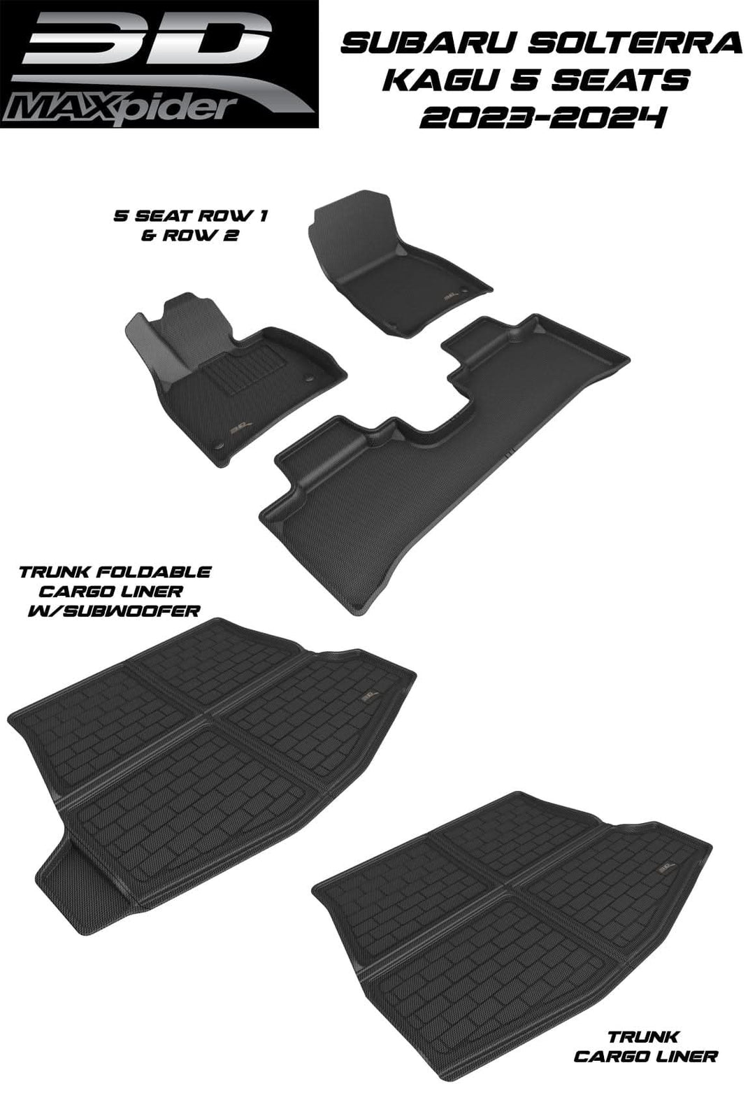 For ultimate quality and an overall superior aesthetic, the 3D MAXpider Custom Fit All-Weather KAGU BLACK Series LHD Floor Mats For Subaru Solterra 5 SEAT 2023-2024 is your ultimate choice. SECURE YOURS NOW.