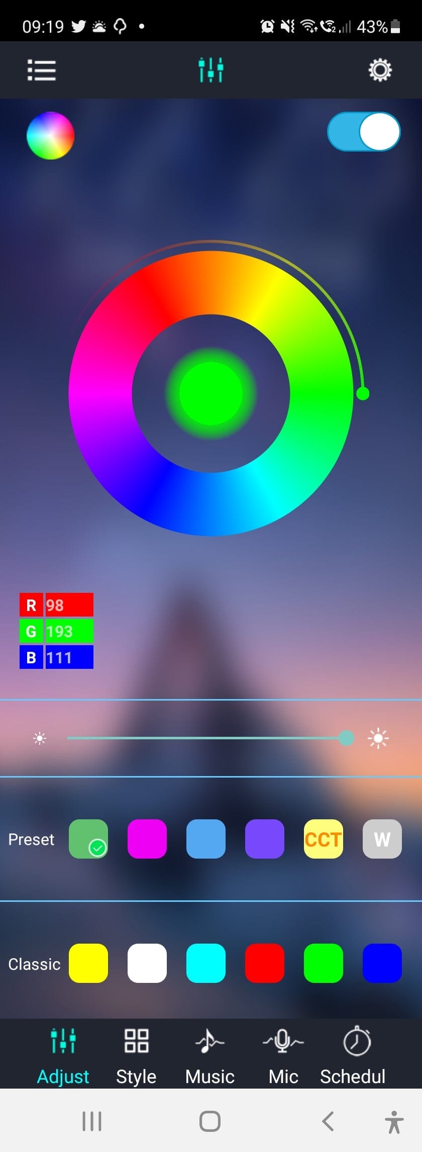 To activate, press the "AMBIENT LIGHTS" button on the touchscreen. There are 3 separate controls for the interior lighting: a physical button, an app, and a touchscreen.