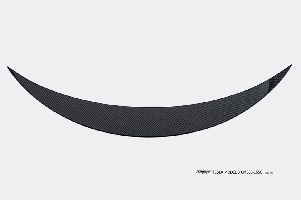 The CMST Genuine Carbon Fiber & FRP Rear Spoiler V5 upgrades your Tesla Model 3 (2024+). This high-performance spoiler improves aerodynamics and gives your Tesla an aggressive look. No adjustments needed for installation.: