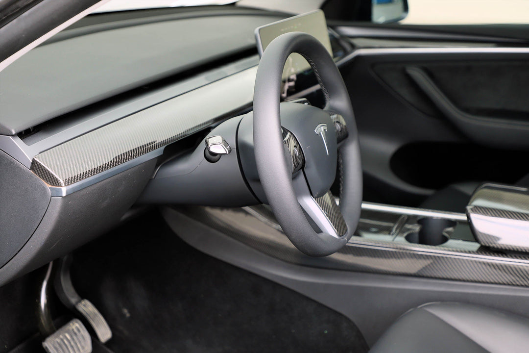 Get this gloss carbon fiber center console full coverage facia to complete the look. These fascias have been precision engineered with the exact fit for Model 3.