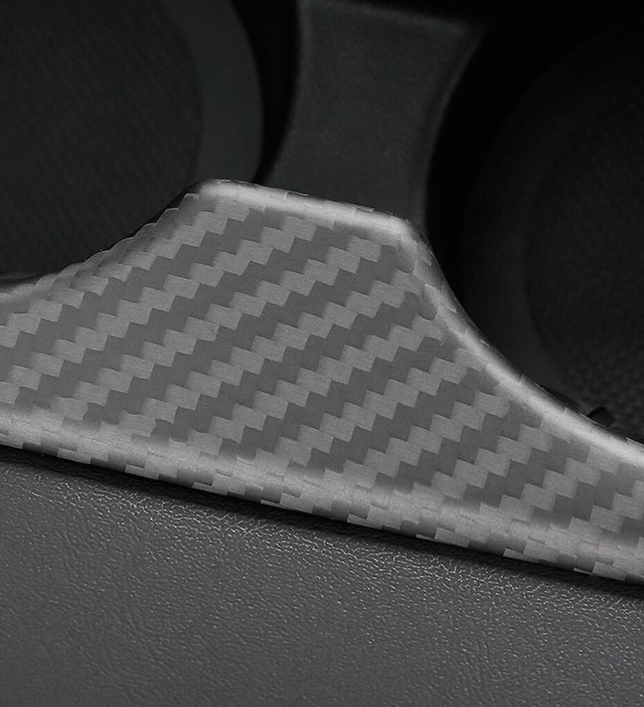 Real carbon fiber fascia that is precision-engineered to fit Model 3 rear cup holder.