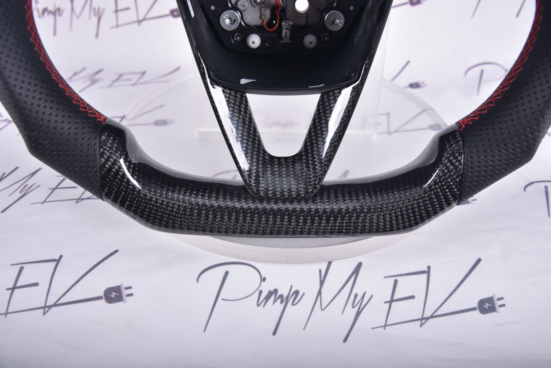 Car Selection: Tesla Model 3 Selected Model S: Model 3 2025 Highland Your Selected Shape: Rounded lifted base Your Selected Style: Half leather half carbon Selected Carbon Fiber Finish: Gloss Carbon Fiber Selected Stripe Options: Red Selected Grip Option: Black perforated Thumb Trims: With matching thumb trims Selected Stitching Colors: Red Heated steering: With heating elements Custom Airbag Selection: Without custom airbag Turning Knob: No Turning Knob