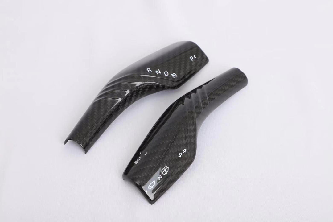 Real carbon fiber trims that are precision-engineered to fit Model Y wiper and turn signal stalks.