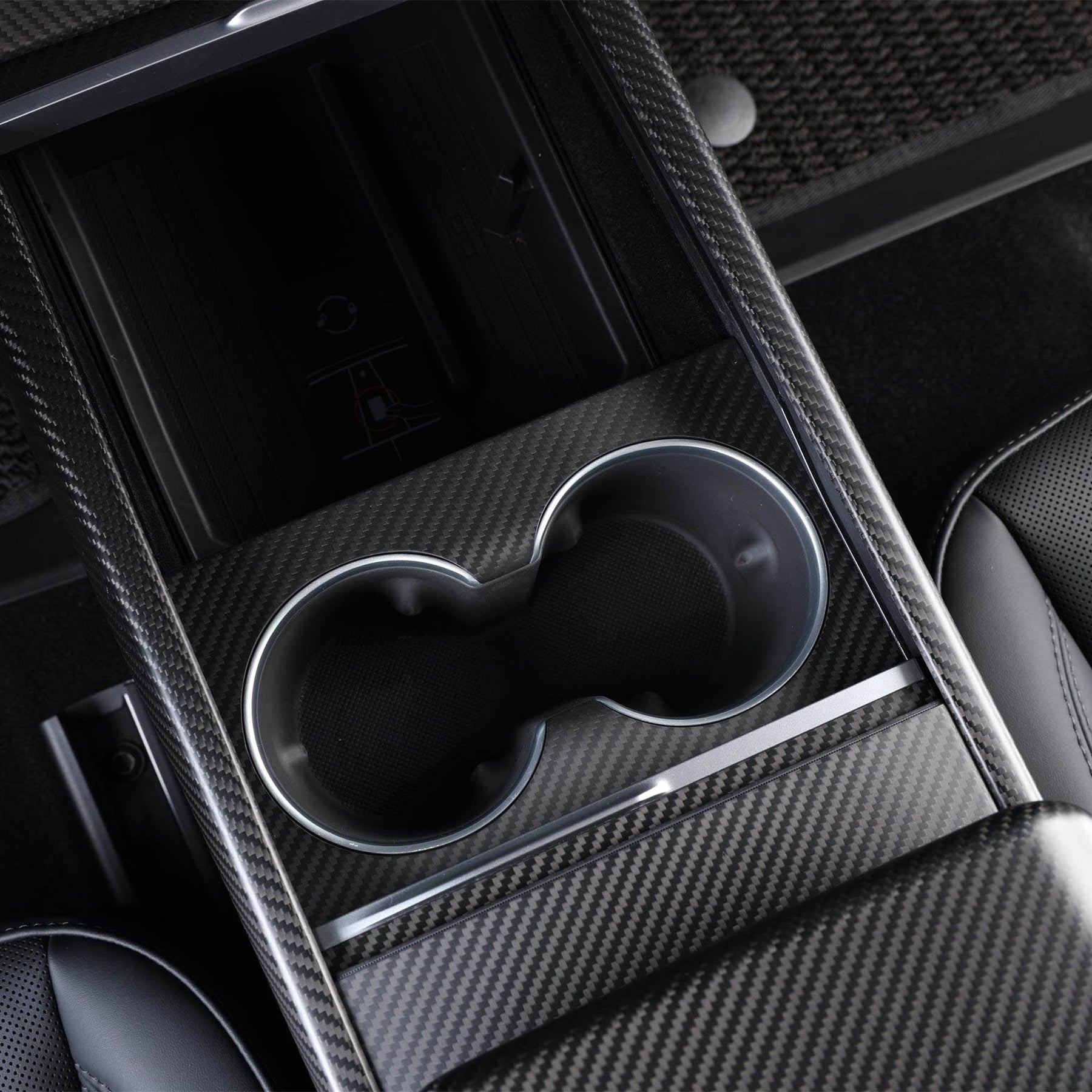 Real Molded Matte Carbon Fiber Front Cup Holder Overlay Cover for Tesla Model 3 2023-2024 Highland - PimpMyEV